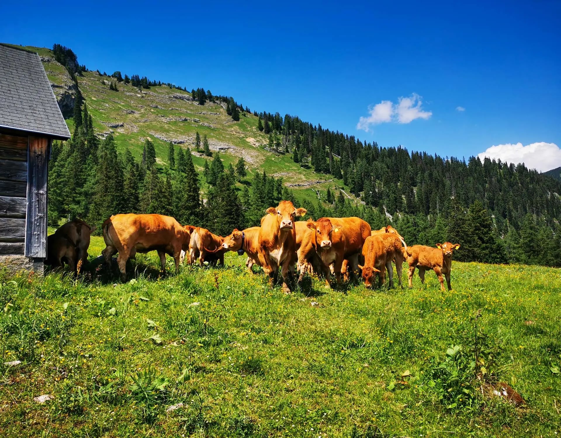 Nach einer verdienten Gipfelrast machen wir uns auf den Rückweg und genießen den Tag bei der Almhütte mit Bier (oder Hollersaft) und Jause.